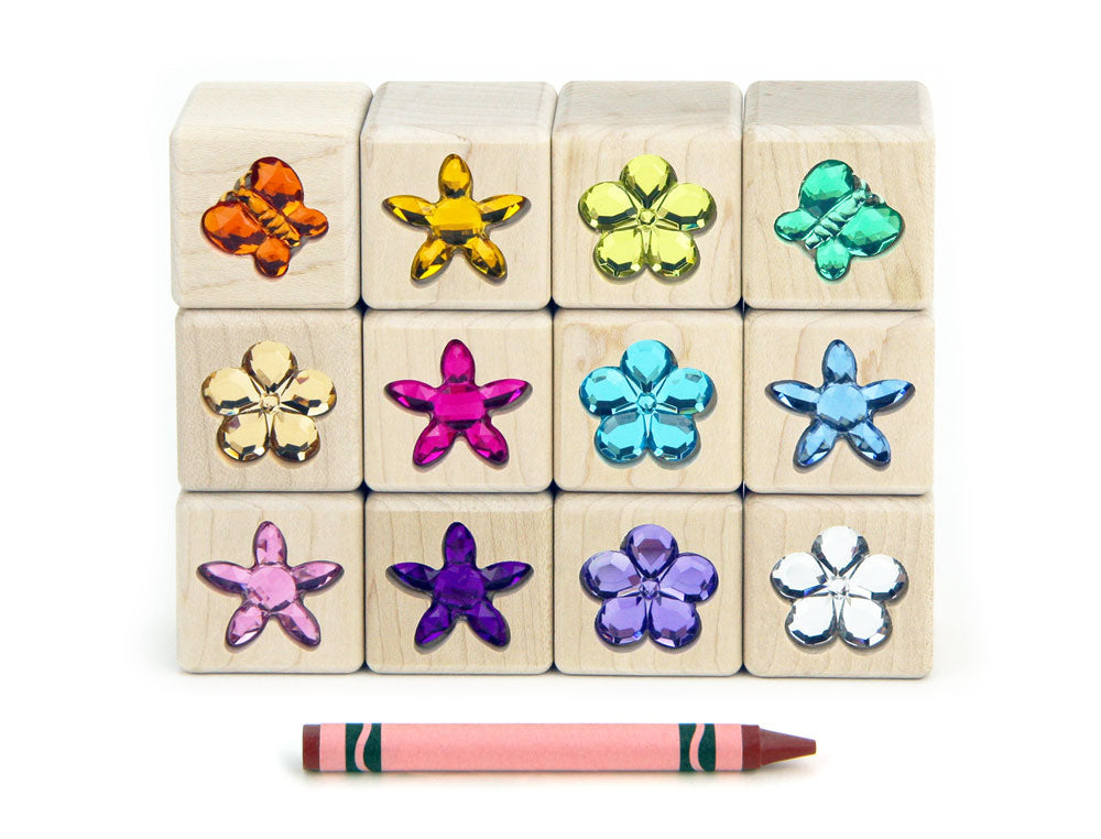 Everwood Friends™ 12-piece Flower Garden Cube Gem Unit Blocks includes 12 solid maple building block cubes, each with a different color high-quality acrylic gem securely inset on one side, including 10 flowers and 2 butterflies. Recommended for ages 3+.