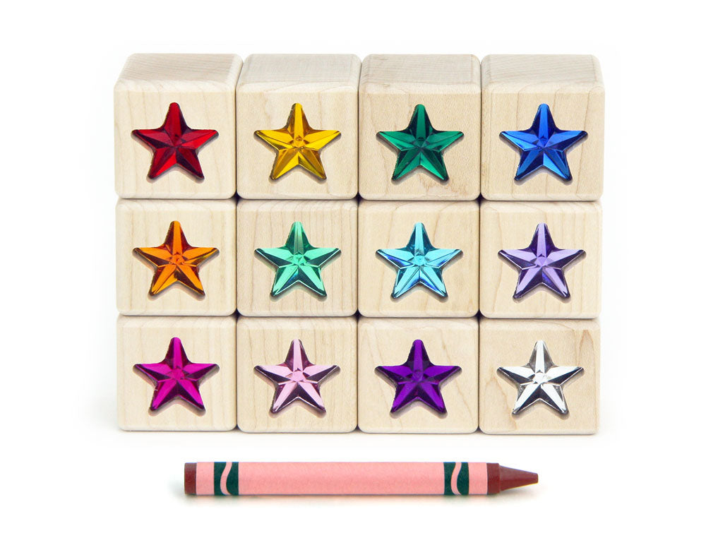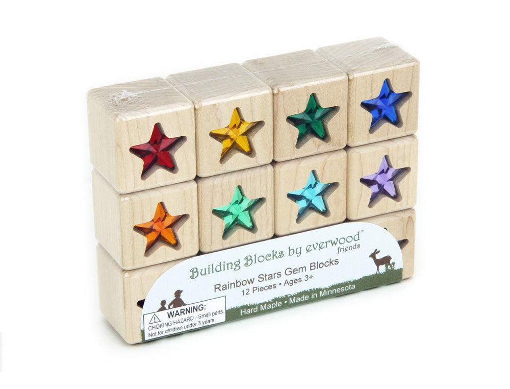 Everwood Friends™ 12-piece Rainbow Stars Cube Gem Unit Blocks includes 12 solid maple building block cubes, each with a different color high-quality acrylic gem securely inset on one side. Recommended for ages 3+.