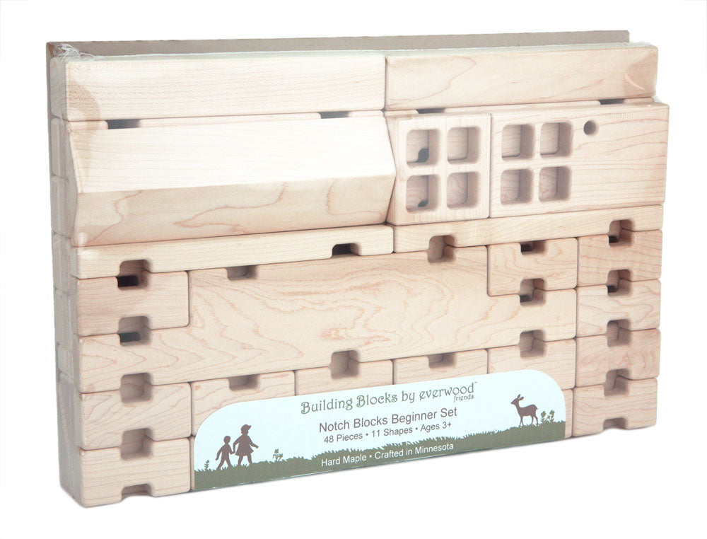 Everwood Friends™ 48 piece Beginner set of hard maple notch blocks provides all the blocks needed to begin building exciting notch block structures and is a wonderful start to a notch block collection.