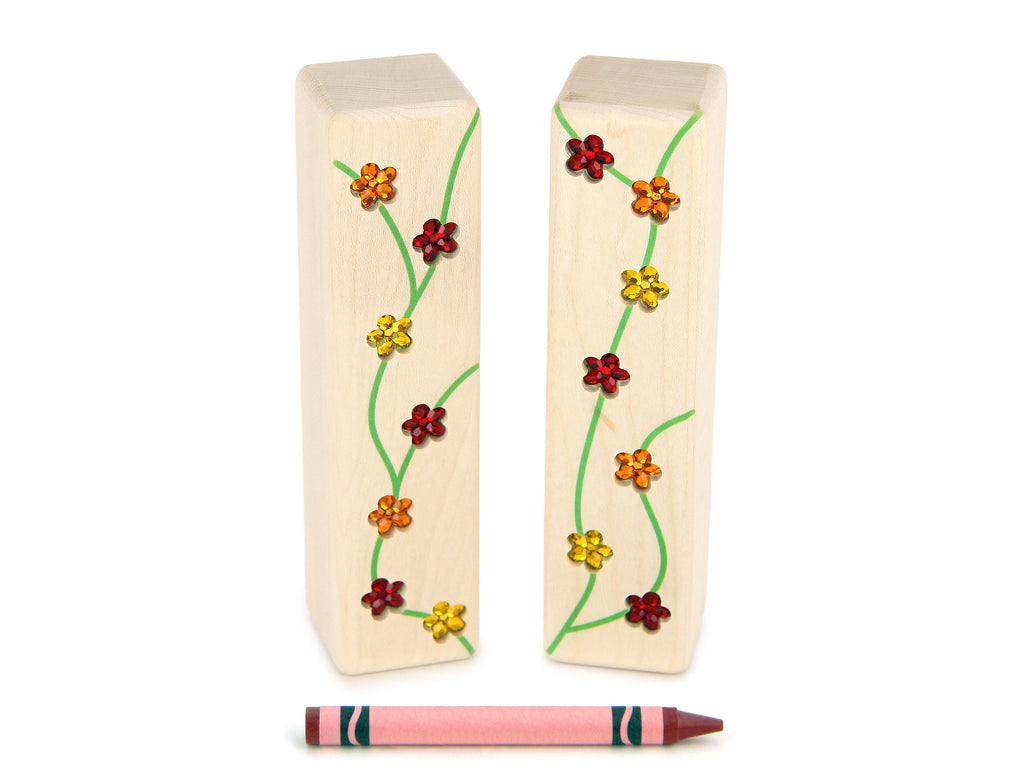 Everwood Friends® 2 pc. Flower Pillars set is beautifully printed with durable kid-safe ink and securely inset with light blue and pink sparkling acrylic gems on one side.