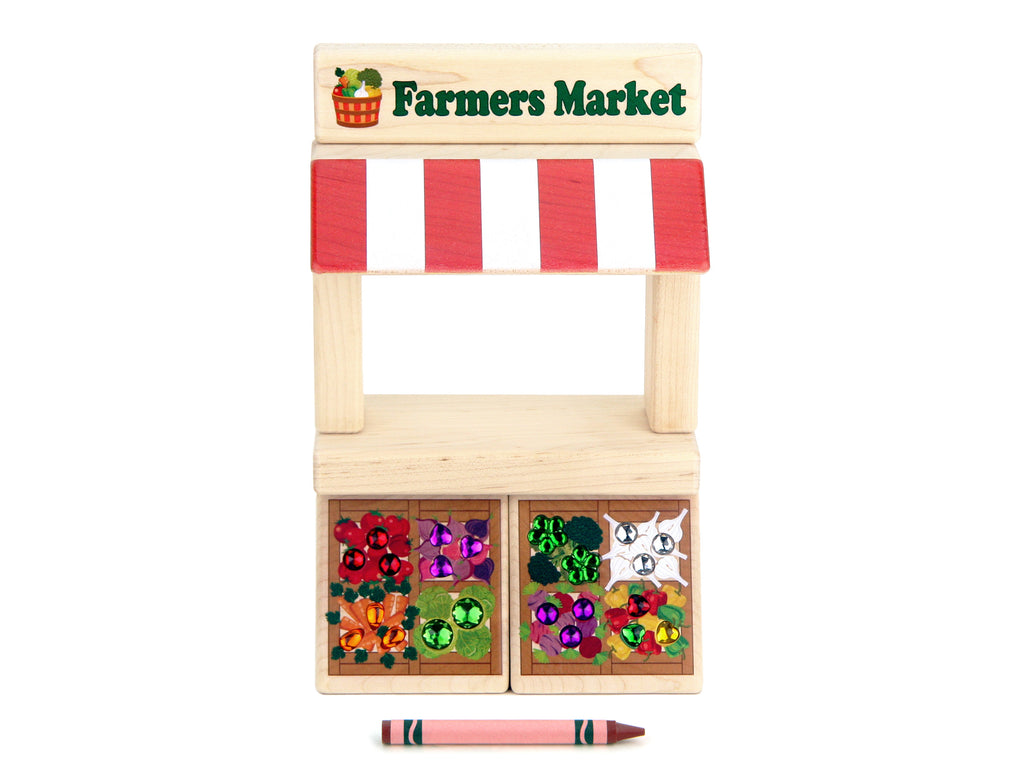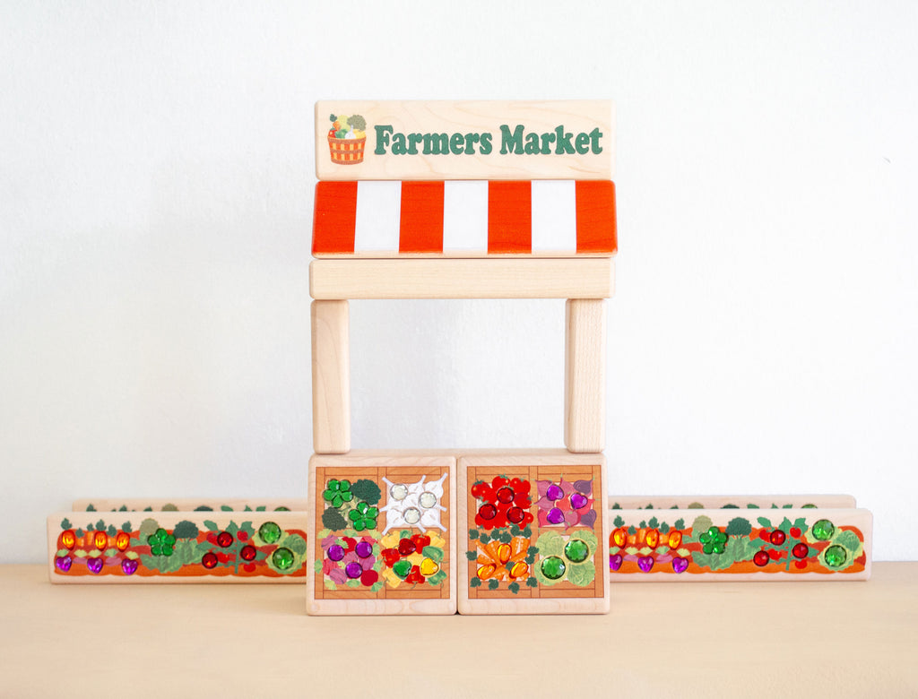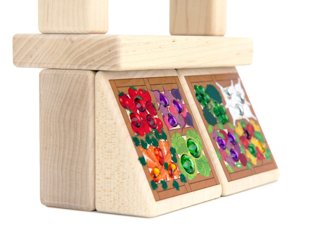 Everwood Friends® Farmers Market is full of special blocks, including pieces printed with durable kid-safe ink and securely inset with sparkling acrylic gems on one side. In fact, several blocks included are ONLY available in this set!
