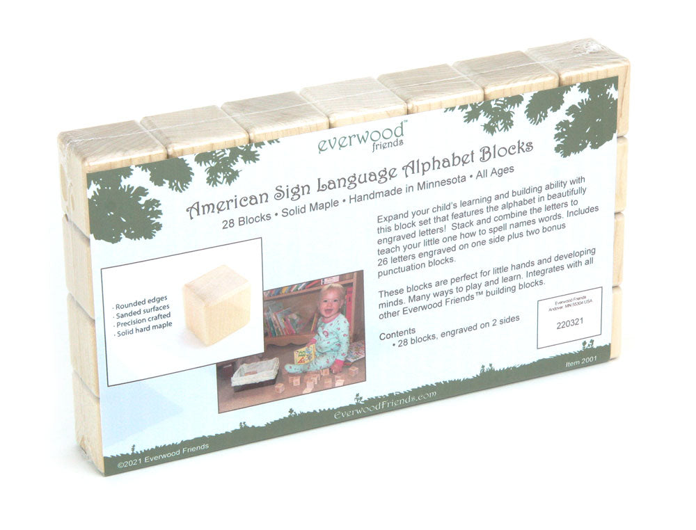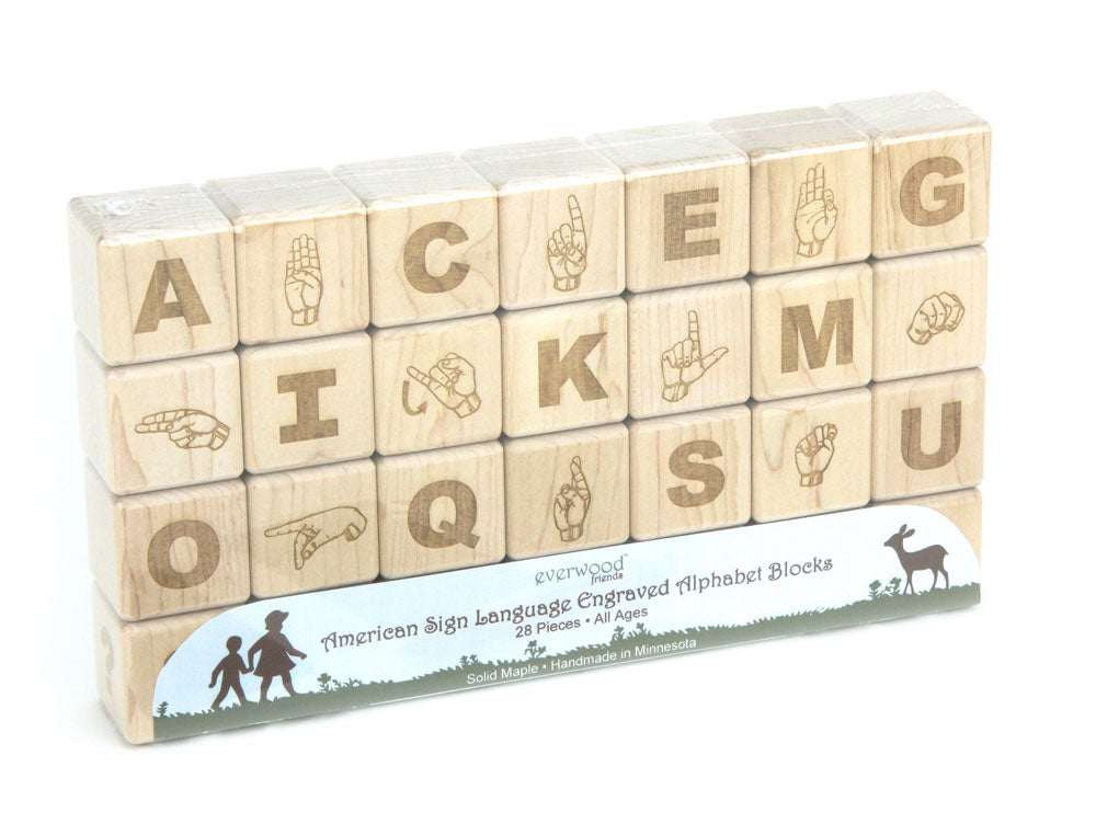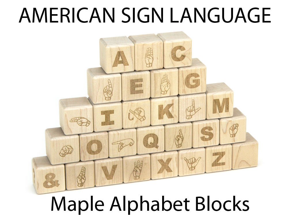 Teach your little one to finger spell, and expand your child's spelling and building skills with this natural maple block set that features the ASL alphabet permanently engraved on one side. The reverse side is engraved with Uppercase letters.