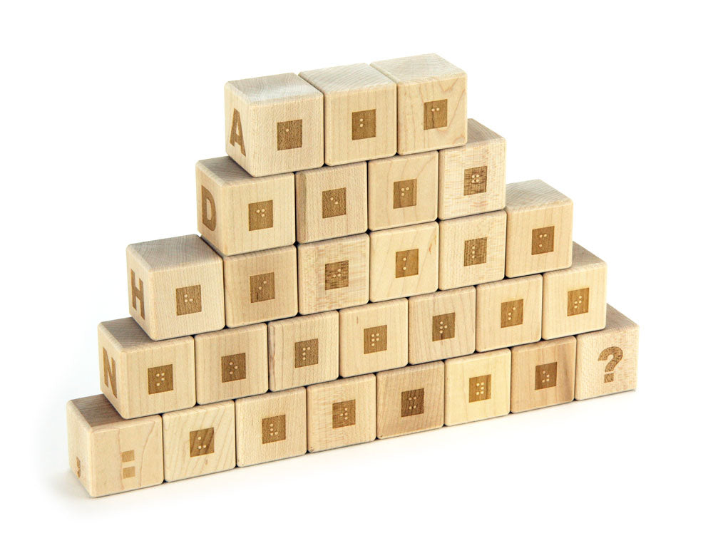 Expand your child's learning and building ability with this block set that features the alphabet lovingly engraved in upper and lower case letters, Braille and British Sign Language! Stack and combine the letters to create words, teach your little one how to finger spell, and experience genuine Braille.