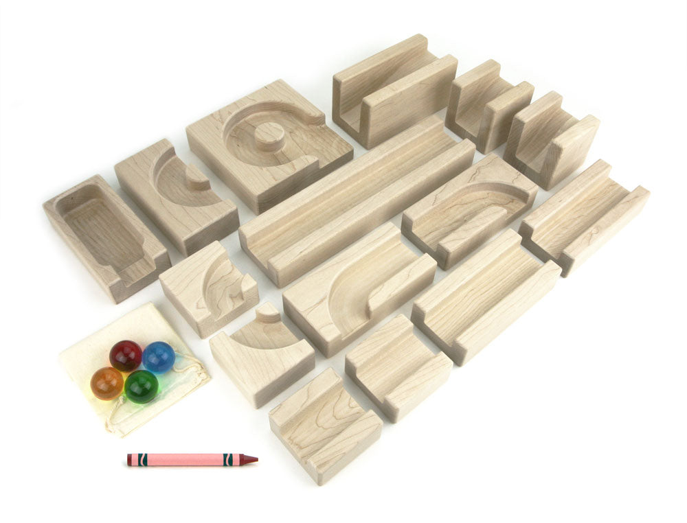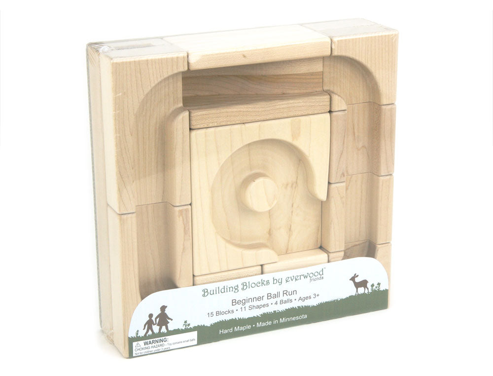 With its wide variety of 15 blocks in 11 shapes, Everwood Friends™ 15 piece Beginner set of hard maple ball run building blocks will grow with a child’s ability and is a wonderful start to a ball run block collection.