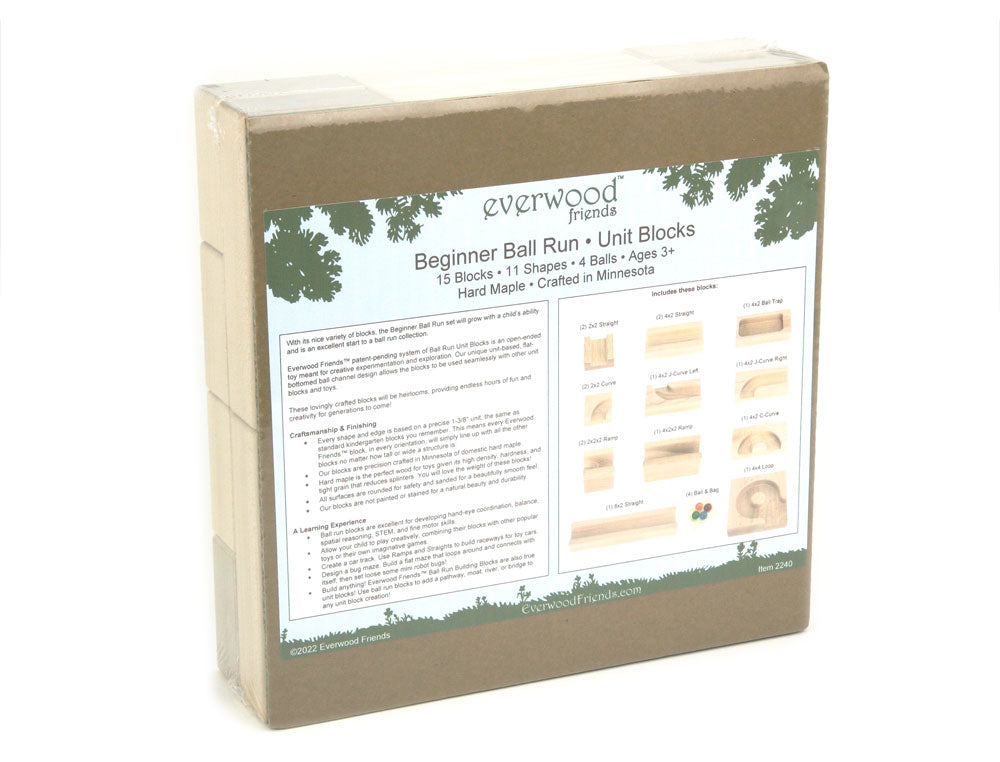 Everwood Friends® system of Ball Run Unit Blocks is an open-ended building toy meant for creative experimentation and exploration. Our unique unit-based, flat-bottomed ball channel design allows the blocks to be used seamlessly with other unit blocks and toys.