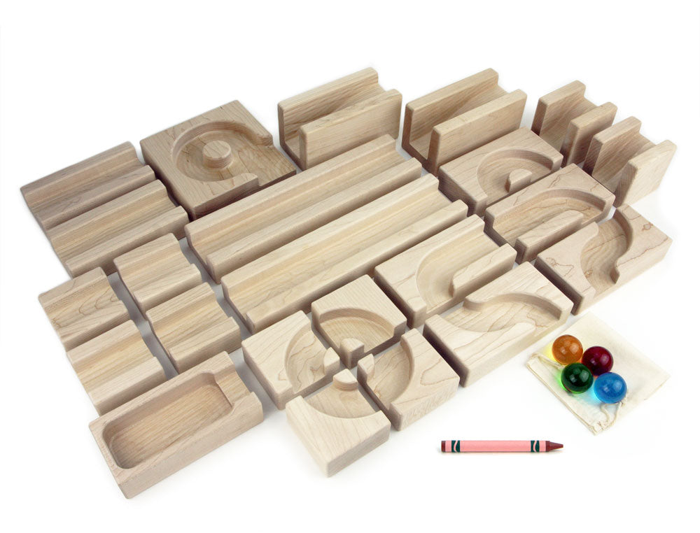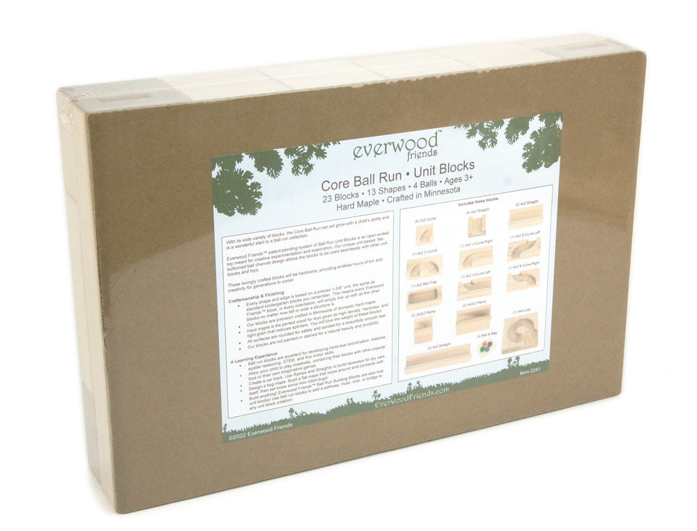 Everwood Friends® 23 piece Core set of hard maple ball run building blocks is a perfect start for girls and boys to build exciting ball runs, and serves as the foundation for our more advanced sets.