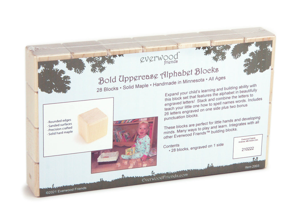 Expand your child's spelling and building skills with this natural maple block set that features the alphabet permanently engraved on one side.