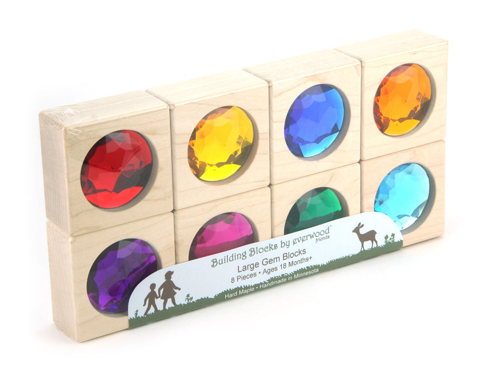 Everwood Friends™ 8-piece Gem Unit Blocks include 8 solid maple building blocks, each with a giant, high-quality 2" acrylic gem securely inset on one side. The set includes 1 each of 8 different color gems. Recommended for ages 18 months+.