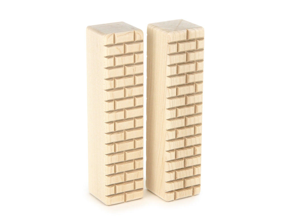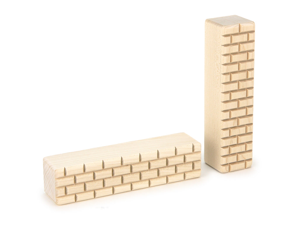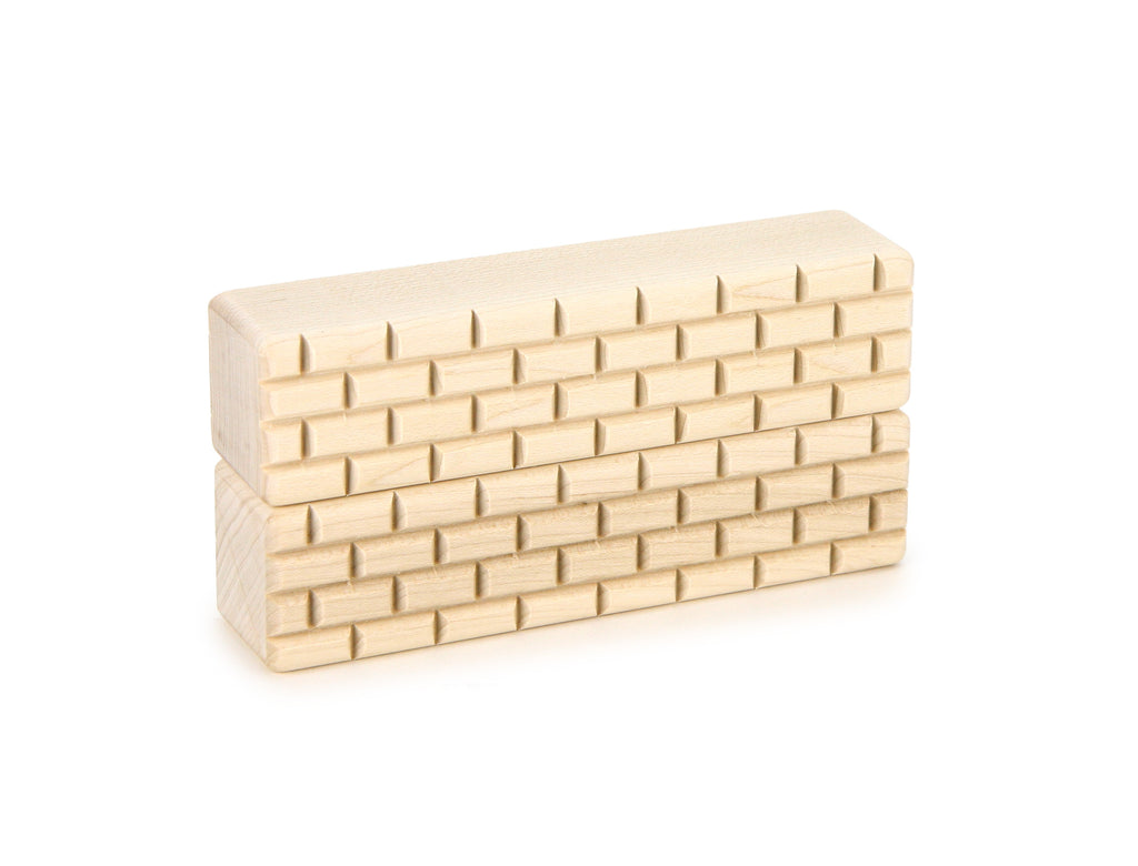 This is a set of 2 solid maple building blocks with a brick pattern carved into two faces. Bricks are oriented in the horizontal direction on one side, and vertical direction on the opposite side for two ways to build!
