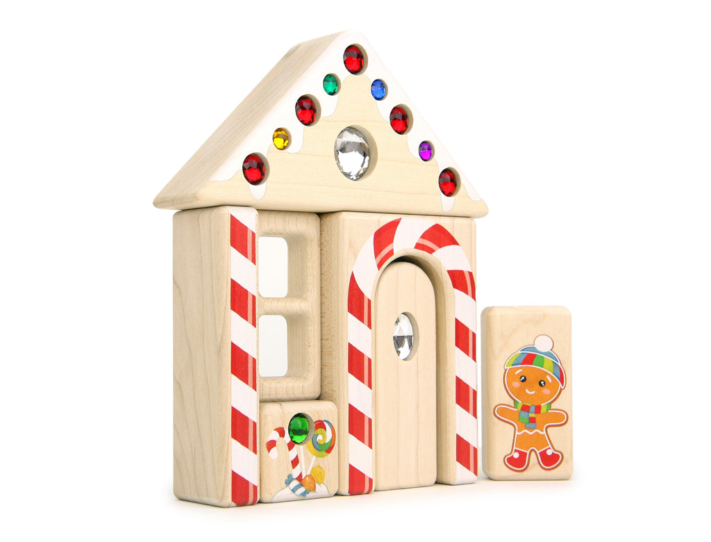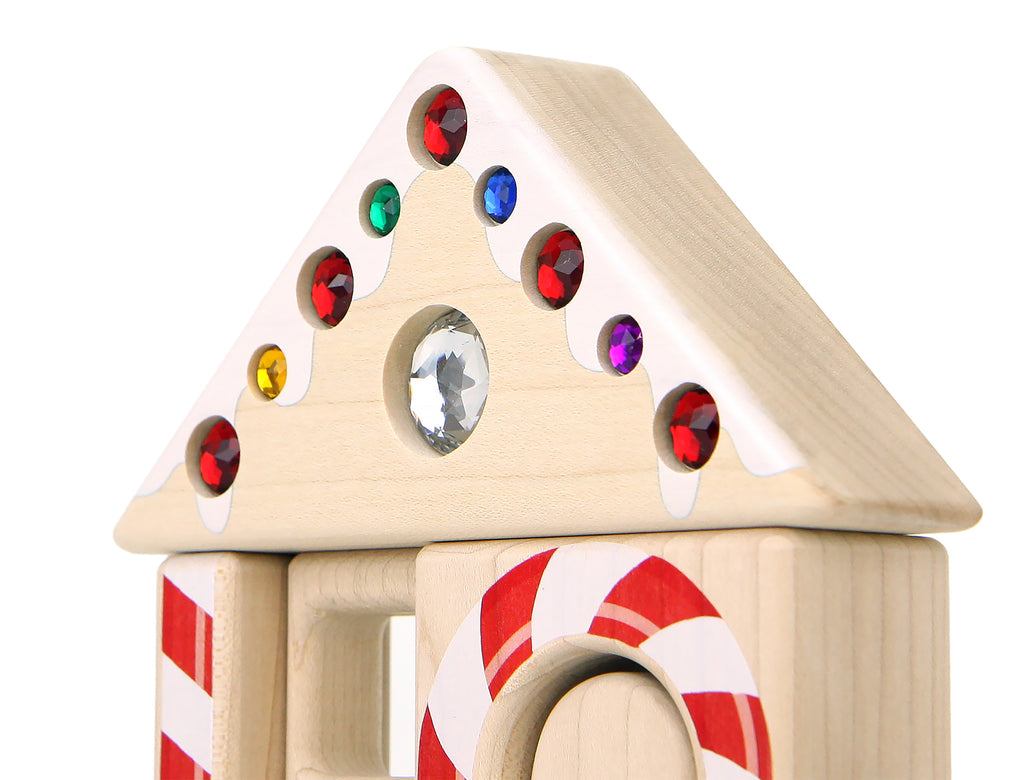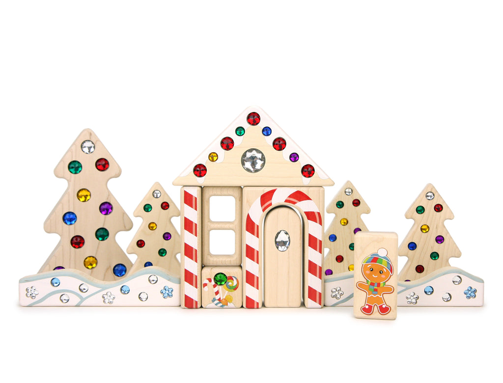 Everwood Friends® Gingerbread House set is brimming with special blocks, including pieces printed with durable kid-safe ink and securely inset with sparkling acrylic gems on one side.