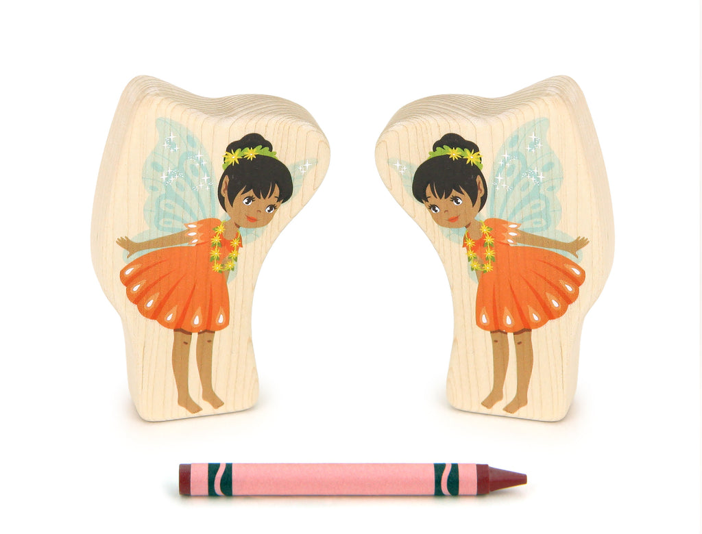 Each made from a single solid hard maple block, Everwood Friends Faerie Grove fairies feature beautiful artwork printed with durable kid-safe ink on both sides. Fairies bring action and life to Faerie Grove!