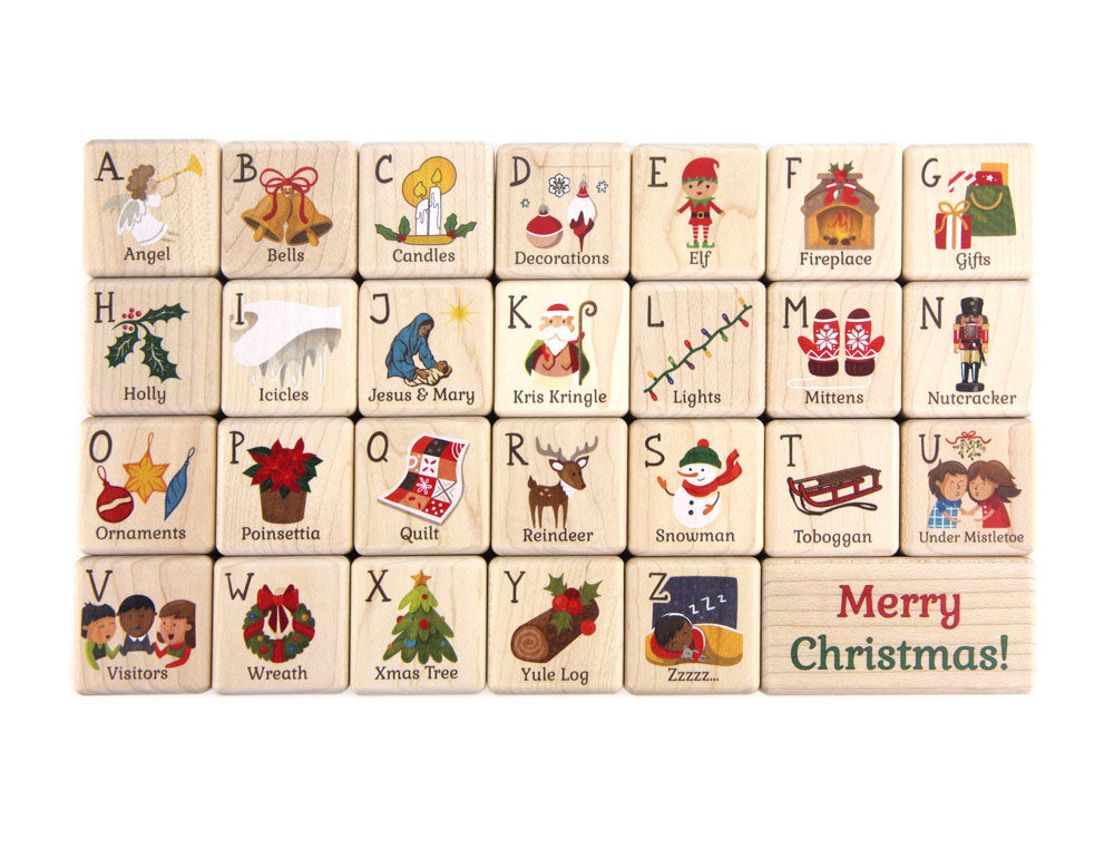 - 27 blocks: 26 Christmas Alphabet 1-3/8" cubes plus 1 bonus "Merry Christmas" block, all printed in durable kid-safe ink on 1 side
