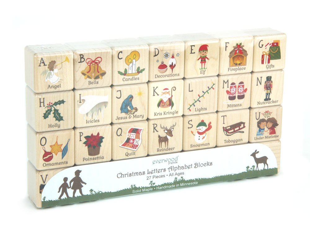 Celebrate the Christmas season and expand your child's spelling and building skills with this solid maple block set featuring adorable and colorful Christmas artwork for each letter of the alphabet.