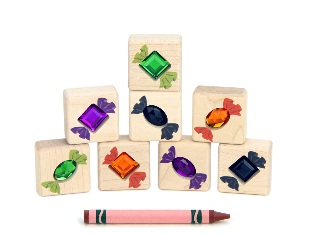 Add sparkle and fun to the season for your little one with these adorable building blocks! Blocks are printed on one side with durable kid-safe ink and each candy block has an acrylic gem securely inset on one side.