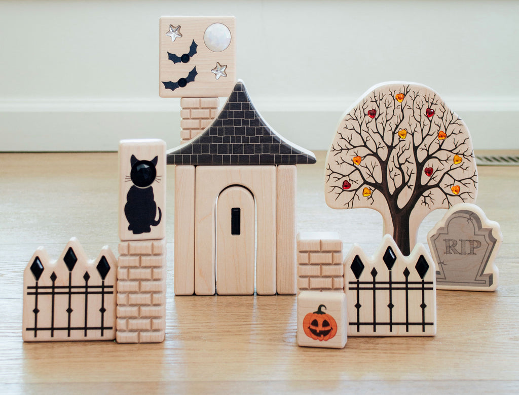 Everwood Friends Haunted Shack is designed to coordinate with the Haunted Mansion and contains several special blocks, including a curved roof printed with durable kid-safe ink and an arch door set securely inset with a sparkling black acrylic gem on one side. These blocks are ONLY available in this set!