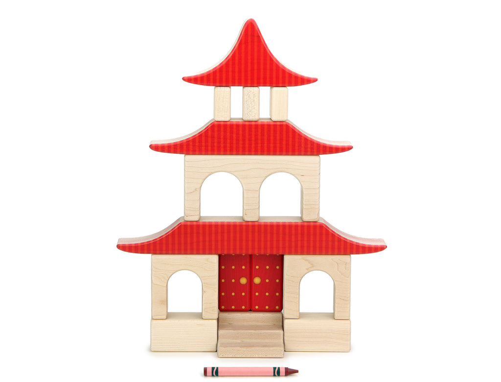 The 14 pc. Ancient Temple set is brimming with special blocks, including three gorgeous Temple Roof pieces and Temple Doors all printed with durable kid-safe ink one side.