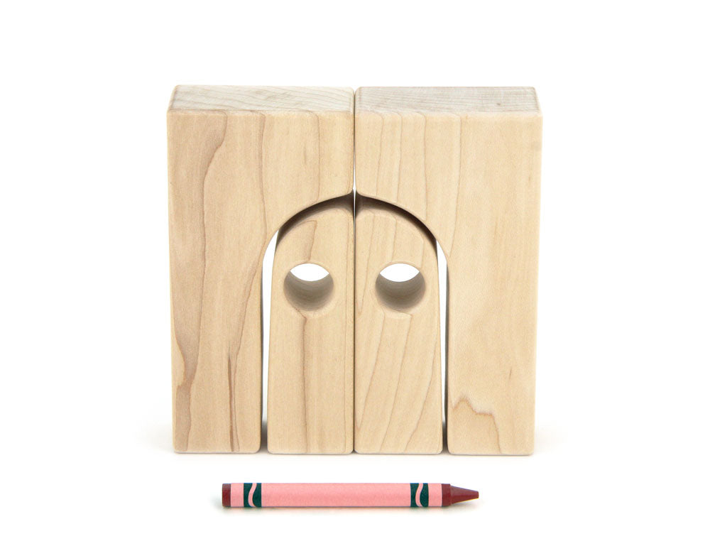 This is a 4-piece set of solid maple building blocks. It contains two 4x2 half arches and two window doors that nest into the half arches.