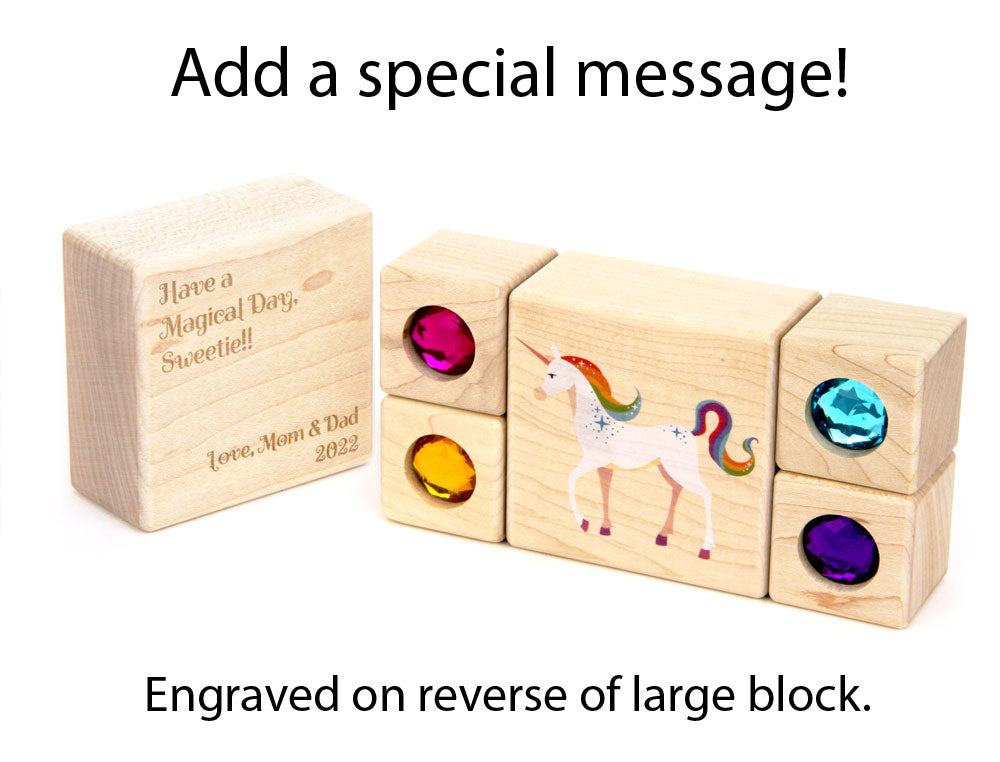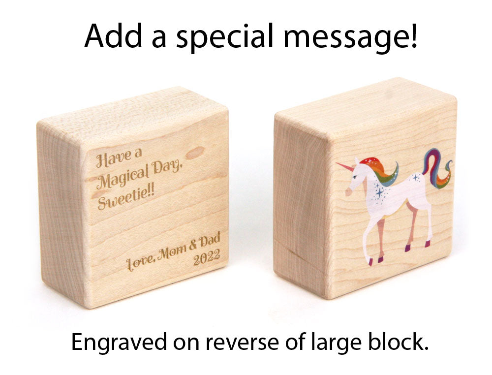 - 1 large block printed on one side with durable, kid-safe ink, optionally engraved on reverse side