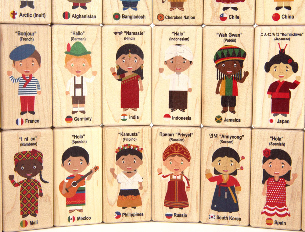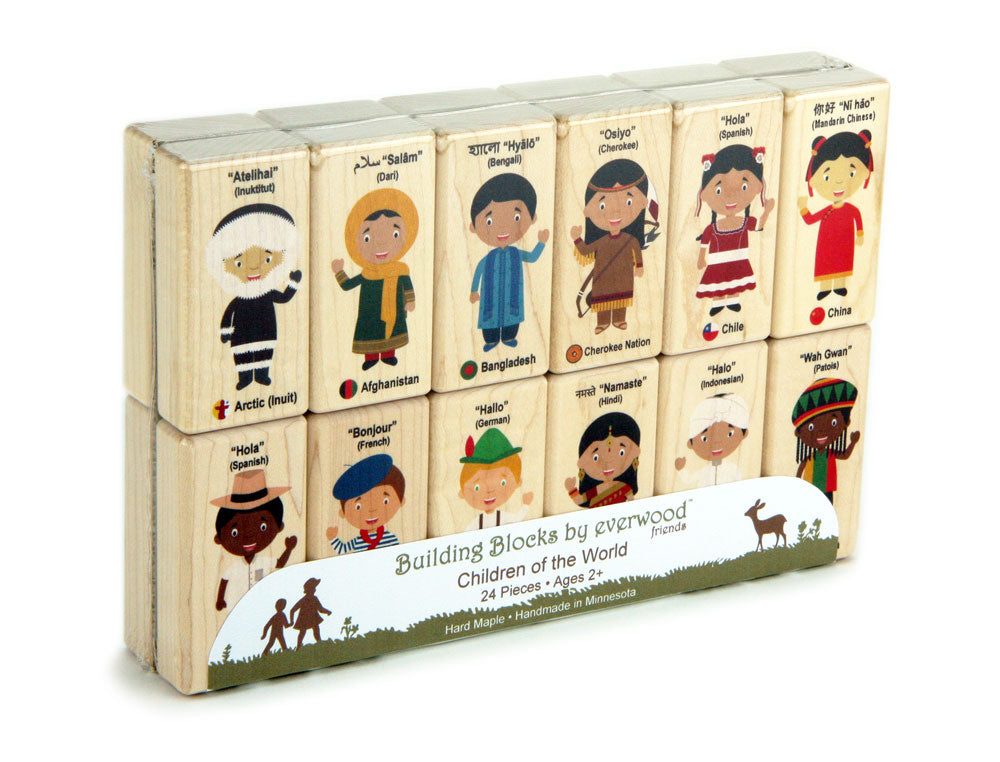 Everwood Friends™ 24-piece Children of the World Block Set includes 24 children in traditional dress vibrantly printed on one side of solid maple blocks with durable kid-safe ink. Each block also shows the child's country, flag symbol, and says "Hello" in their native language!