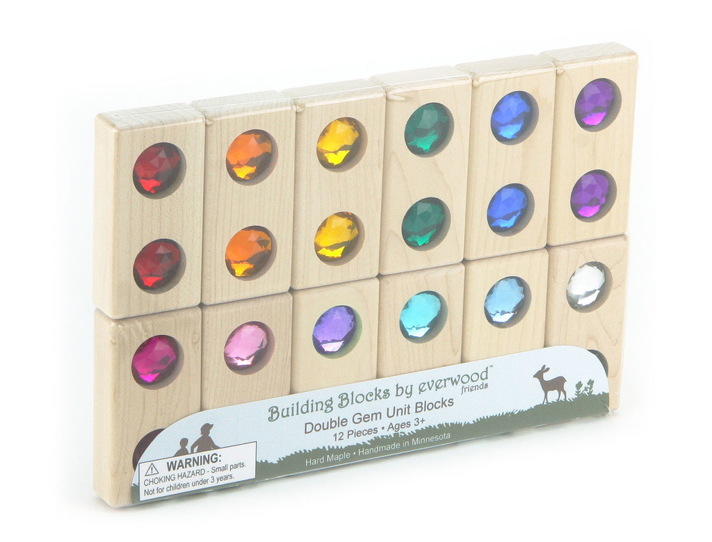 Everwood Friends™ 12-piece Gem Unit Blocks include 12 solid maple building blocks, each with two matching high-quality acrylic gems securely inset on one side. The set includes 12 different color gems. Recommended for ages 3+.