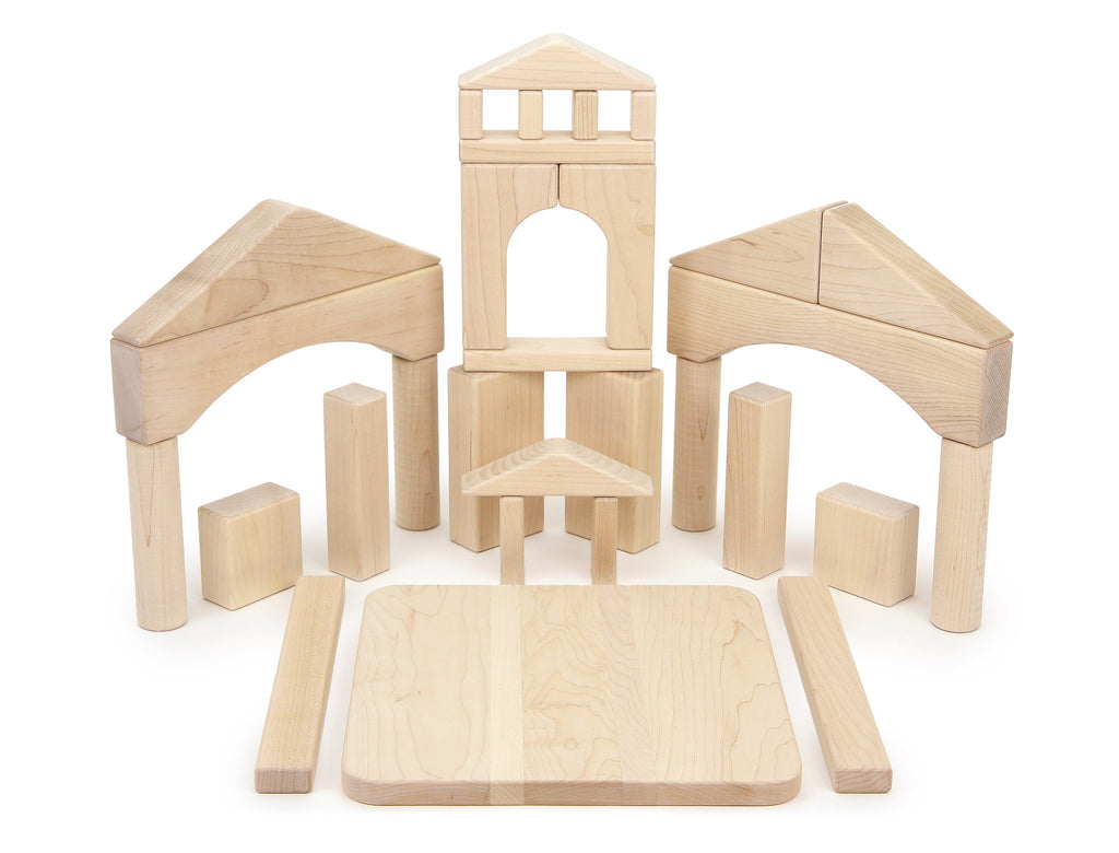 The extra variety of larger and special shapes included in this set helps children build more complex structures. The included solid maple building platform allows kids to build on thick carpet, or to add another level to their structure.