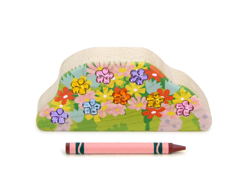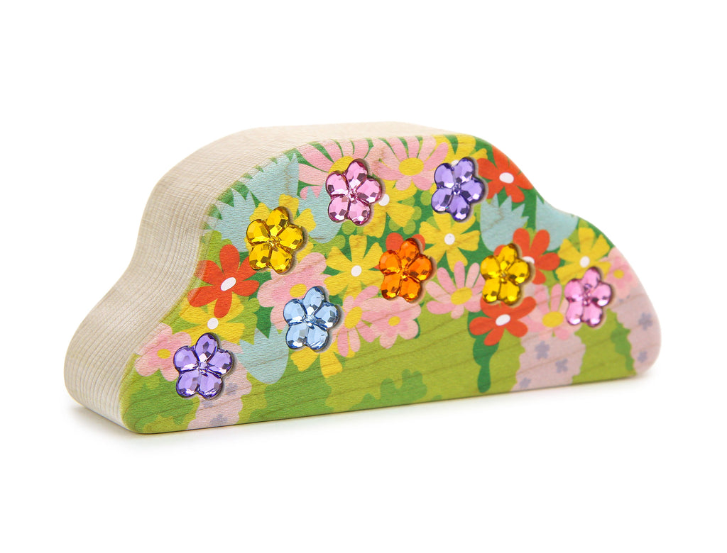 Made from a solid hard maple block 5-1/2" wide, the Faerie Flower Mound features beautiful artwork printed with durable kid-safe ink and 8 sparkling acrylic gemstones securely inset on one side. Perfect for fairies to lounge on or hide behind, the Flower Mound adds to the playful spirit of Faerie Grove!