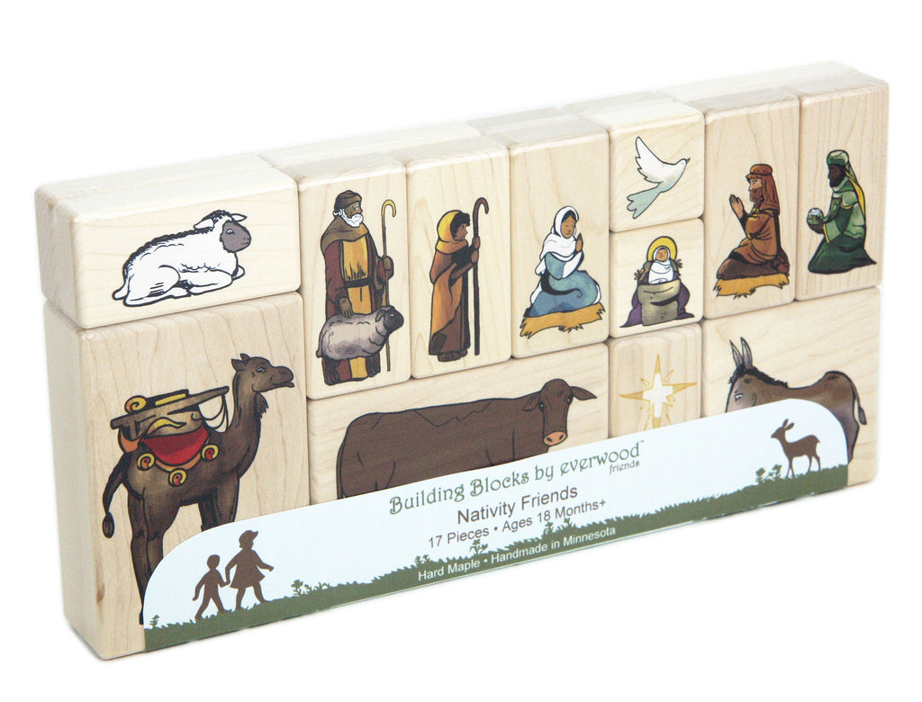 Everwood Friends™ 17-piece Nativity Friends Block Set has 17 vibrant images printed on one side of solid maple blocks with durable kid-safe ink.