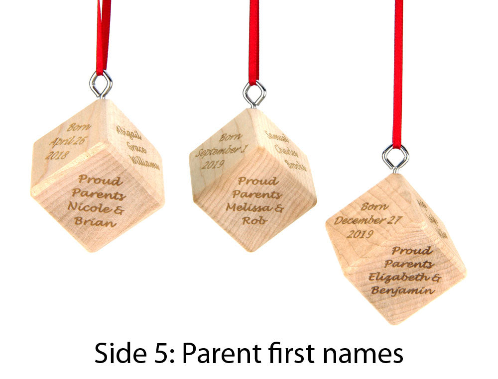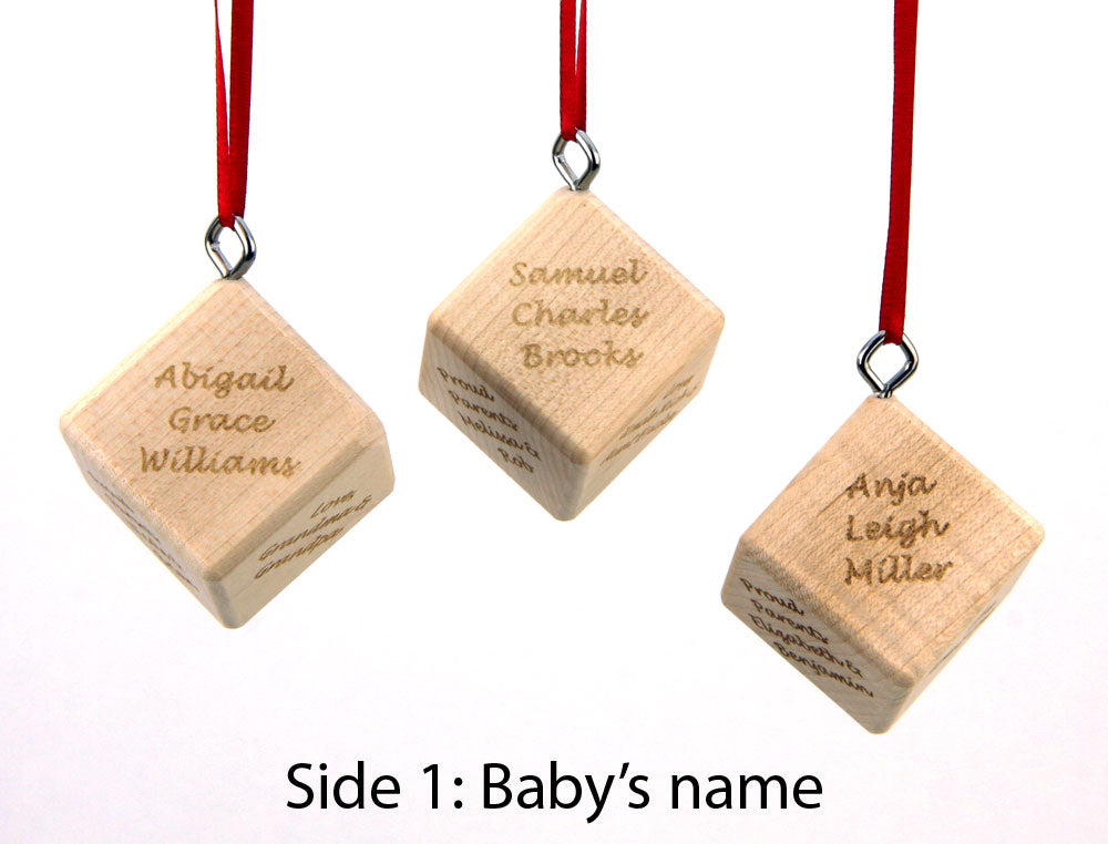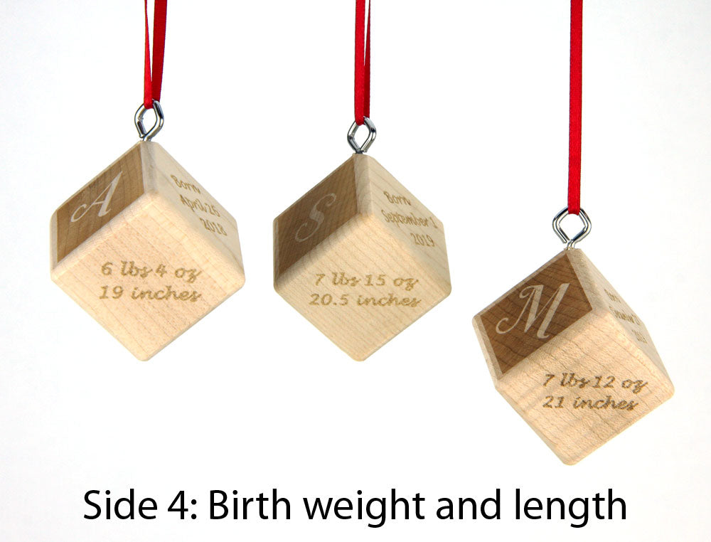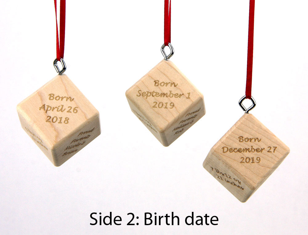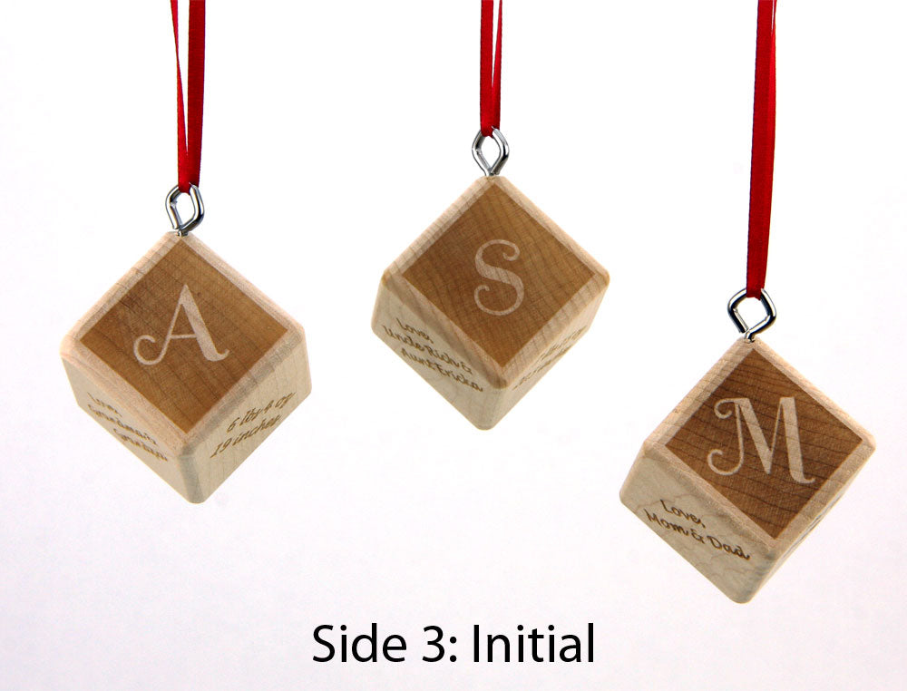 Each ornament is crafted from our 1-3/8" hard maple cubes and engraved on all 6 sides. A satin ribbon is secured to the ornament with a metal eyelet. Comes in a red velvet drawstring bag.