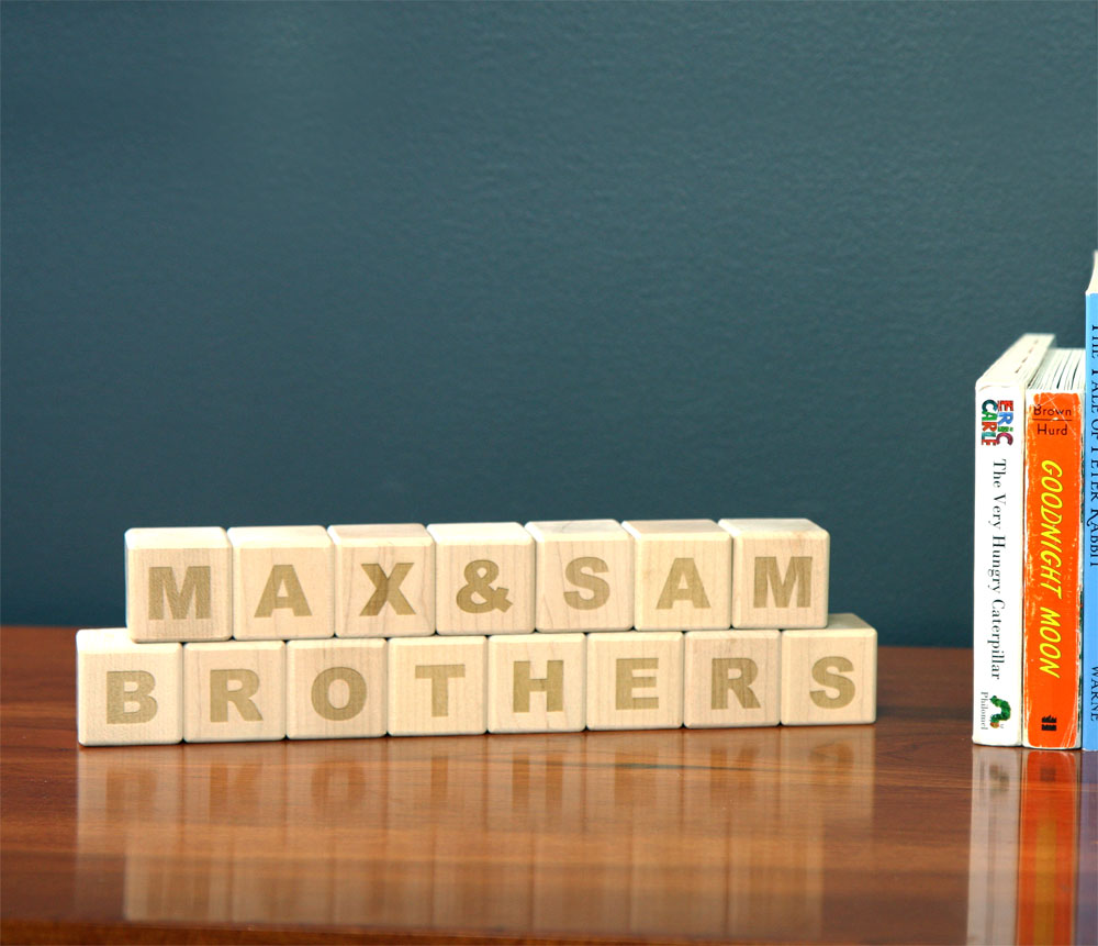 Spell a child's name or a special message, 1 letter per 1-3/8" block. Add engraved image blocks for even more charm. See pictures for images available. Numbers and special characters are also available. Letters are permanently engraved on blocks.